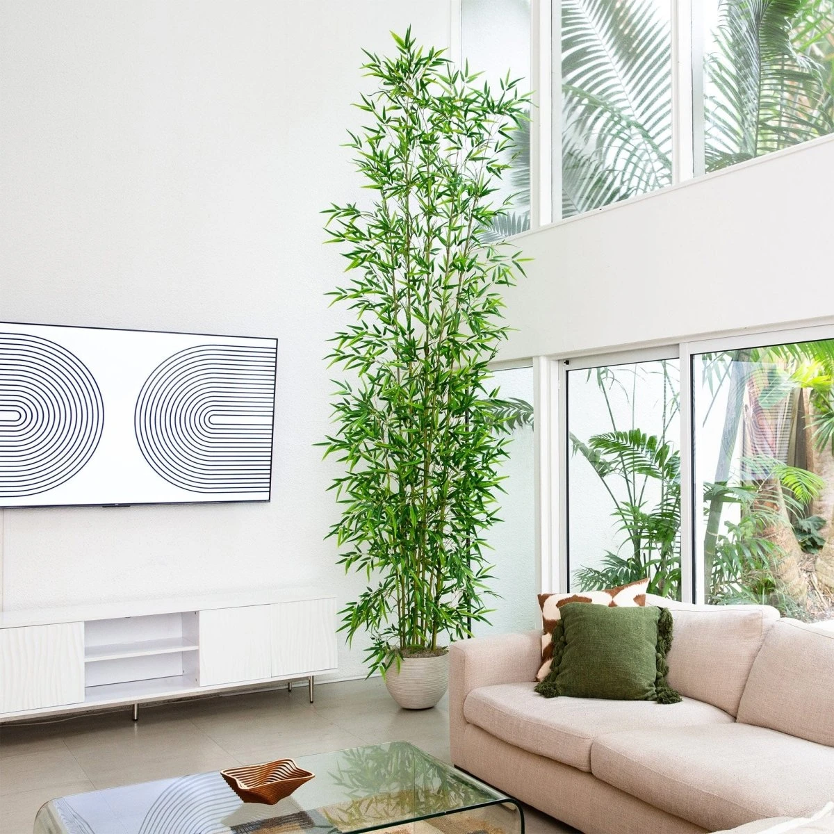 Embrace the serene beauty of Japan with our meticulously crafted bamboo tree, a proud emblem of the country’s rich landscapes. Created by horticulturists with extensive travel in Japan, this piece captures the nuances and quirks of genuine bamboo – from the verdant leaves to the distinctive green branches and stems. The lush canopy is yours to shape, allowing you to bend and shape the branches for a tailored look that suits your space. With an impressive height of 12′ and housed in a nursery planter, feel free to DIY and add in your favorite pot. Perfect for a living room, grand room or as a barrier for privacy, with its tall height, it’s a great piece for spaces with high ceilings.