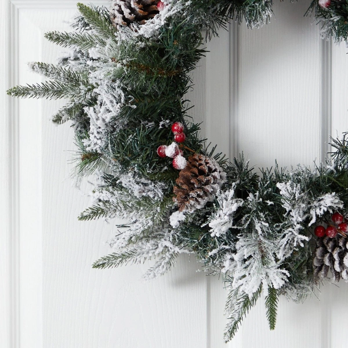 20-in Flocked Mixed Pine Christmas Wreath With LED Lights, Pine Cones & Berries