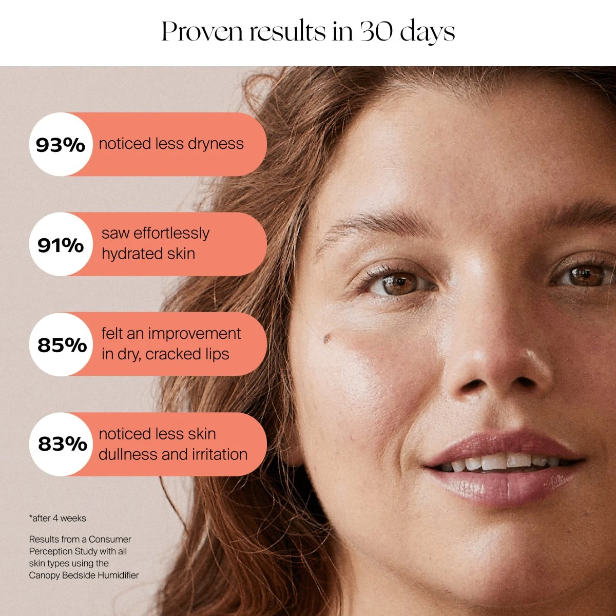 Despite its large coverage area, the Canopy Large Room Humidifier features a sleek, minimalist form that complements any home décor. Its compact 12.5” x 8.5” x 10” footprint fits easily on side tables, plant stands, or nightstands—perfect for apartments, offices, or greenhouses.