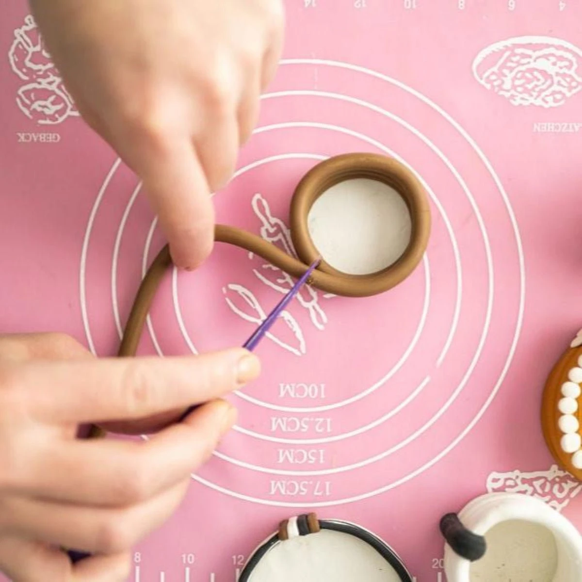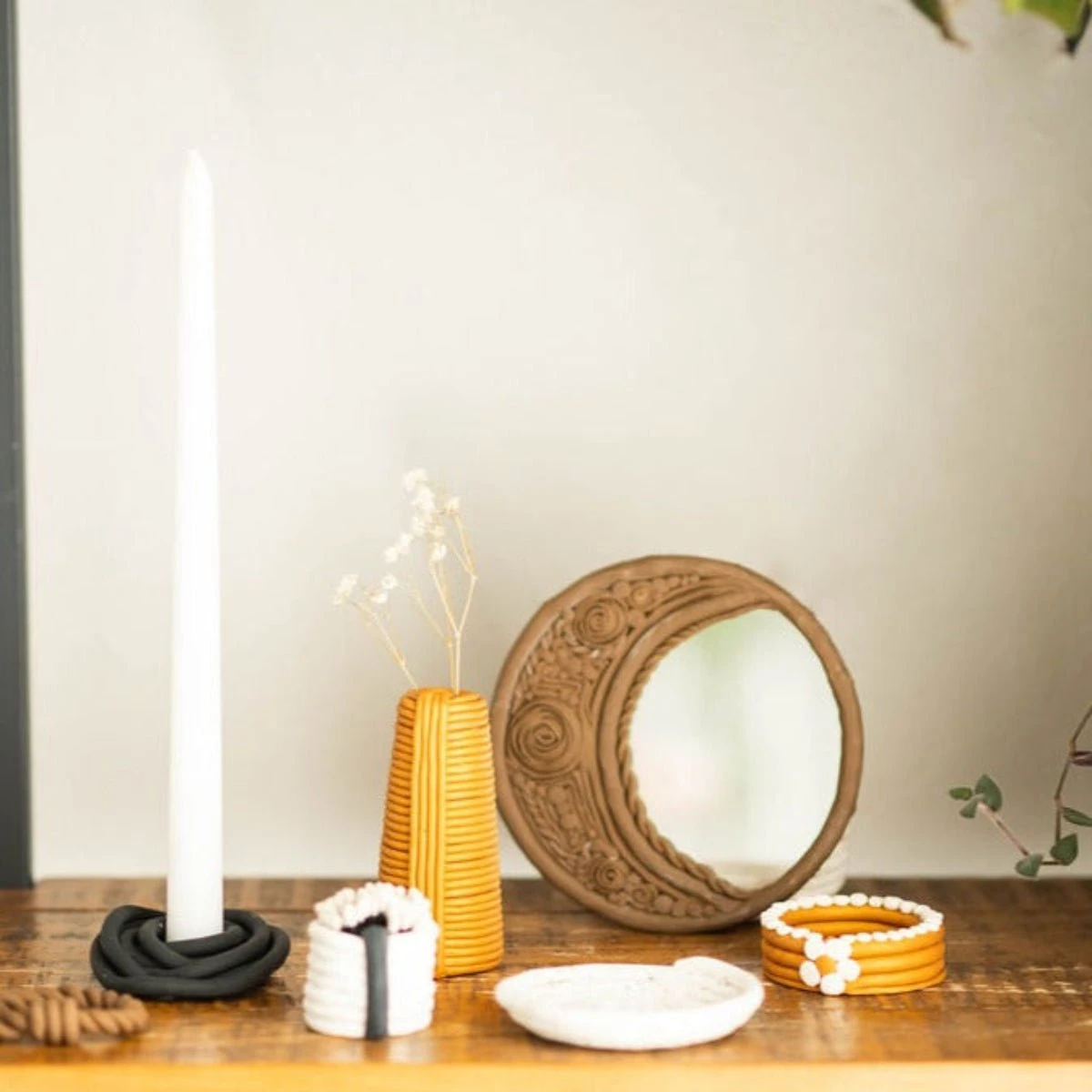 This craft kit includes four neutral-colored clays, the extruder tool, a silicone mat, a mirror, a vase, a match lighting sticker, a roller, and a clay knife. The clay extruder includes 20 interchangeable discs to choose from. Crafters will need an oven and baking sheet.Â