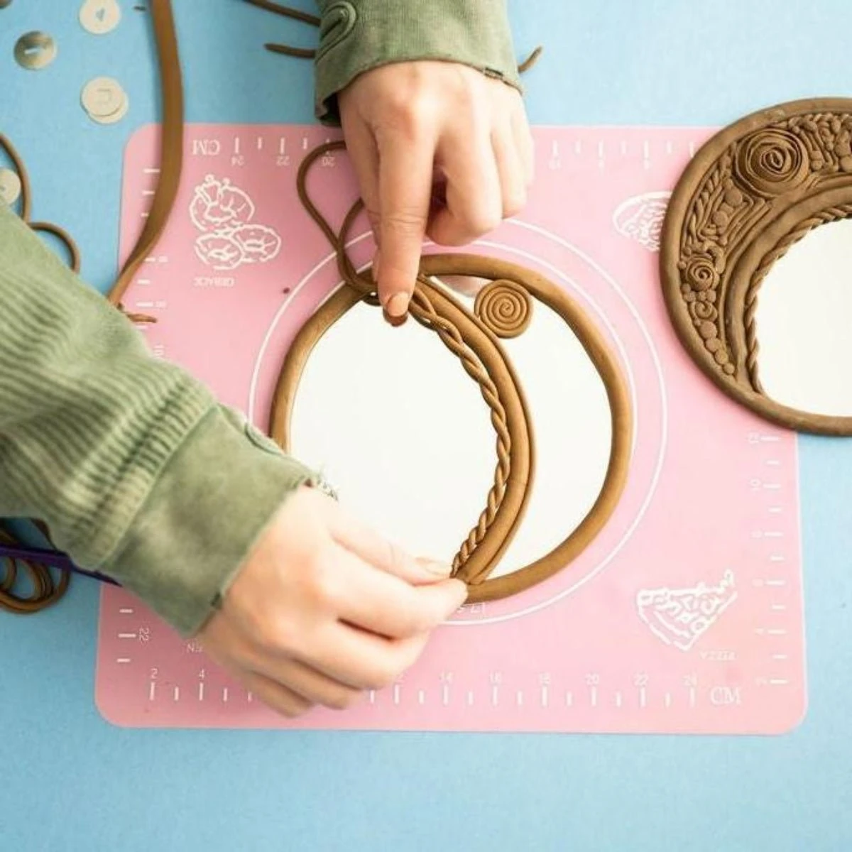 This project takes about one hour to complete. It can take longer depending on the detail, scale, and quantity of clay projects crafters wish to create. These pieces require 15 minutes of oven baking to harden the clay before it can be used. There is enough clay to create 4 to 6 sculpted pieces ranging from 2×2 inches to 6×6 inches. This project includes instruction for multiple projects, it is great to do with a friend!