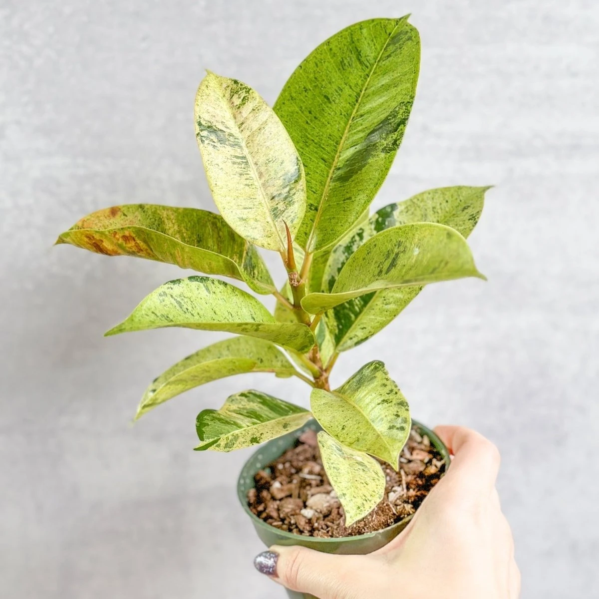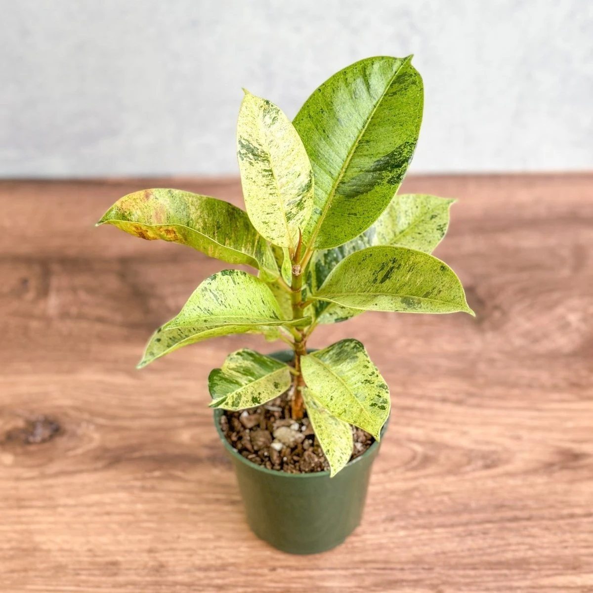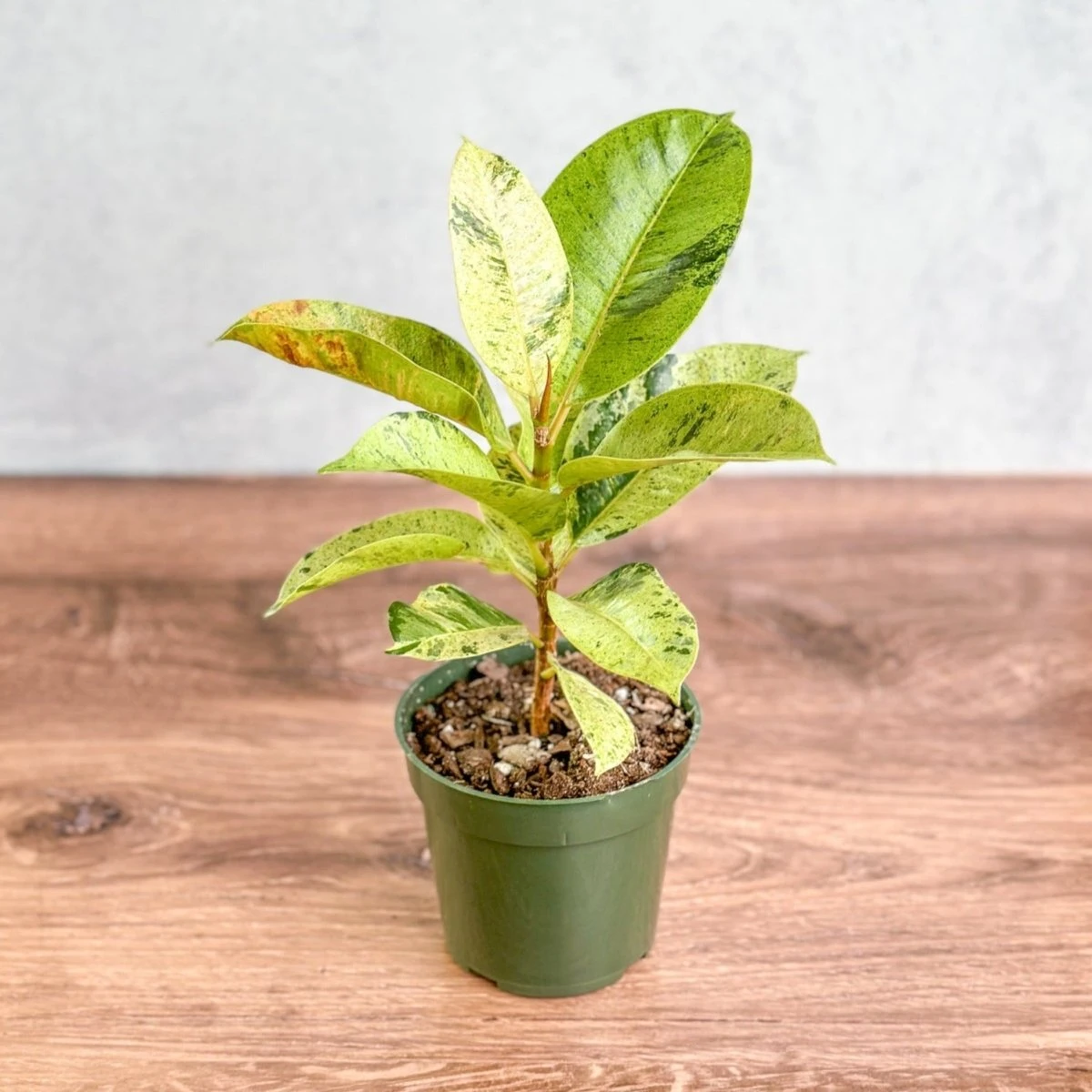 The Ficus Shivereana, also known as the Variegated Rubber Plant, is a captivating houseplant celebrated for its variegated foliage. Its leaves display a mix of light green with cream or white patterns, sometimes accompanied by pinkish hues in new growth, adding a distinctive touch to any indoor setting.