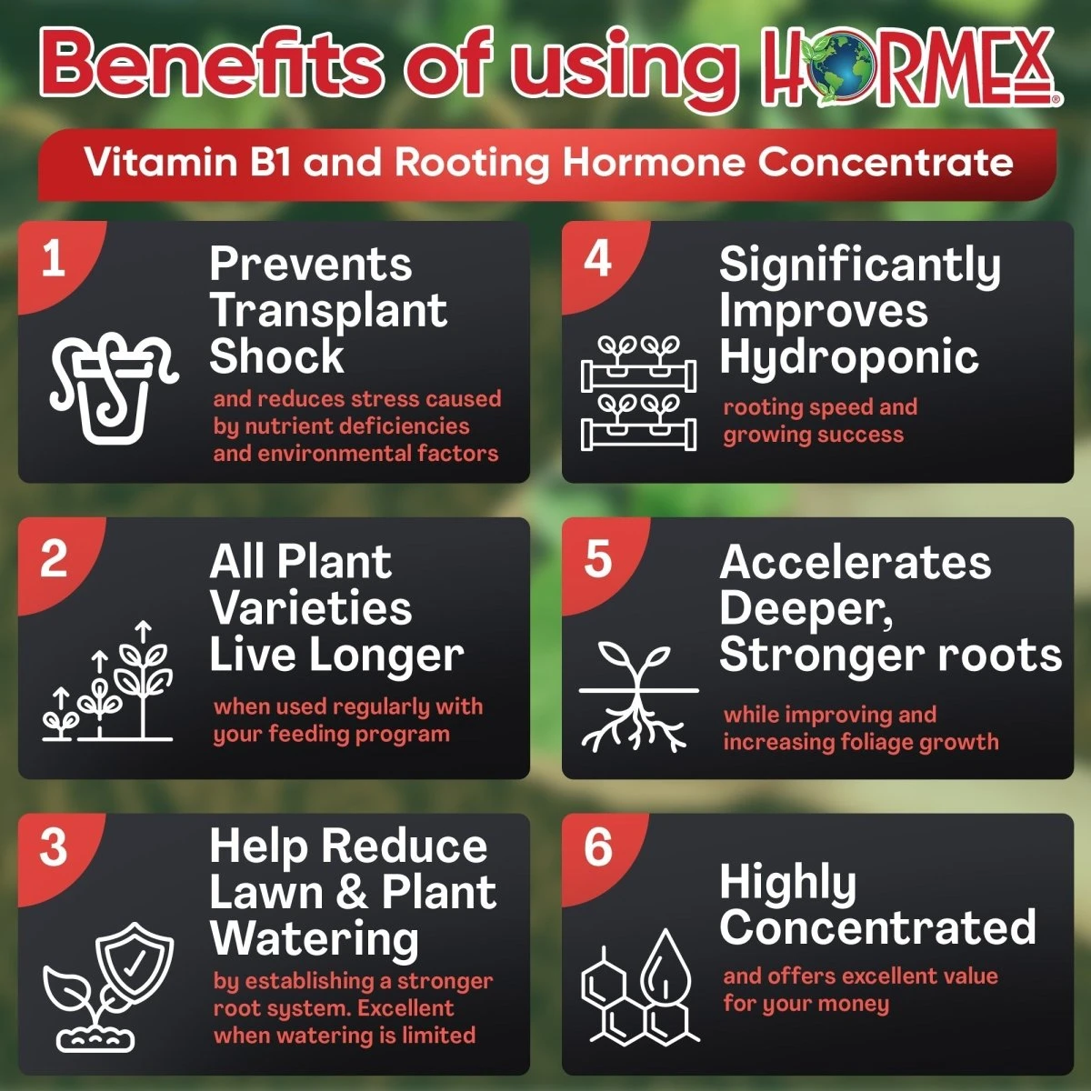 Give your plants a powerful head start with Hormex Rooting Hormone Concentrate—a trusted B1-based formula designed to prevent transplant shock, stimulate root development, and promote vigorous plant growth. Whether you’re growing in soil, hydroponics, or aeroponics, this concentrated solution helps your plants absorb water and nutrients more efficiently for lush foliage and long-term vitality.