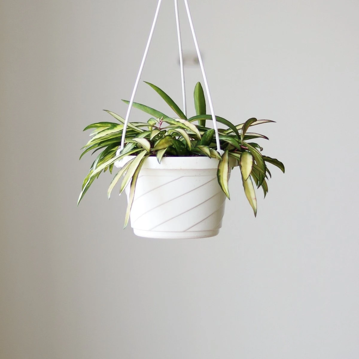 The Hoya Kentiana Variegata is one of the more desired hoya cultivars on the market today and a favorite in our shop. It’s recognizable by showy, fleshy narrow green green leaves with creamy white centers and dark green edges. New growth will appear pink. When cared for properly this plant blooms parachute clusters of star-shaped, red to purple flowers with a dark 5-point center.
