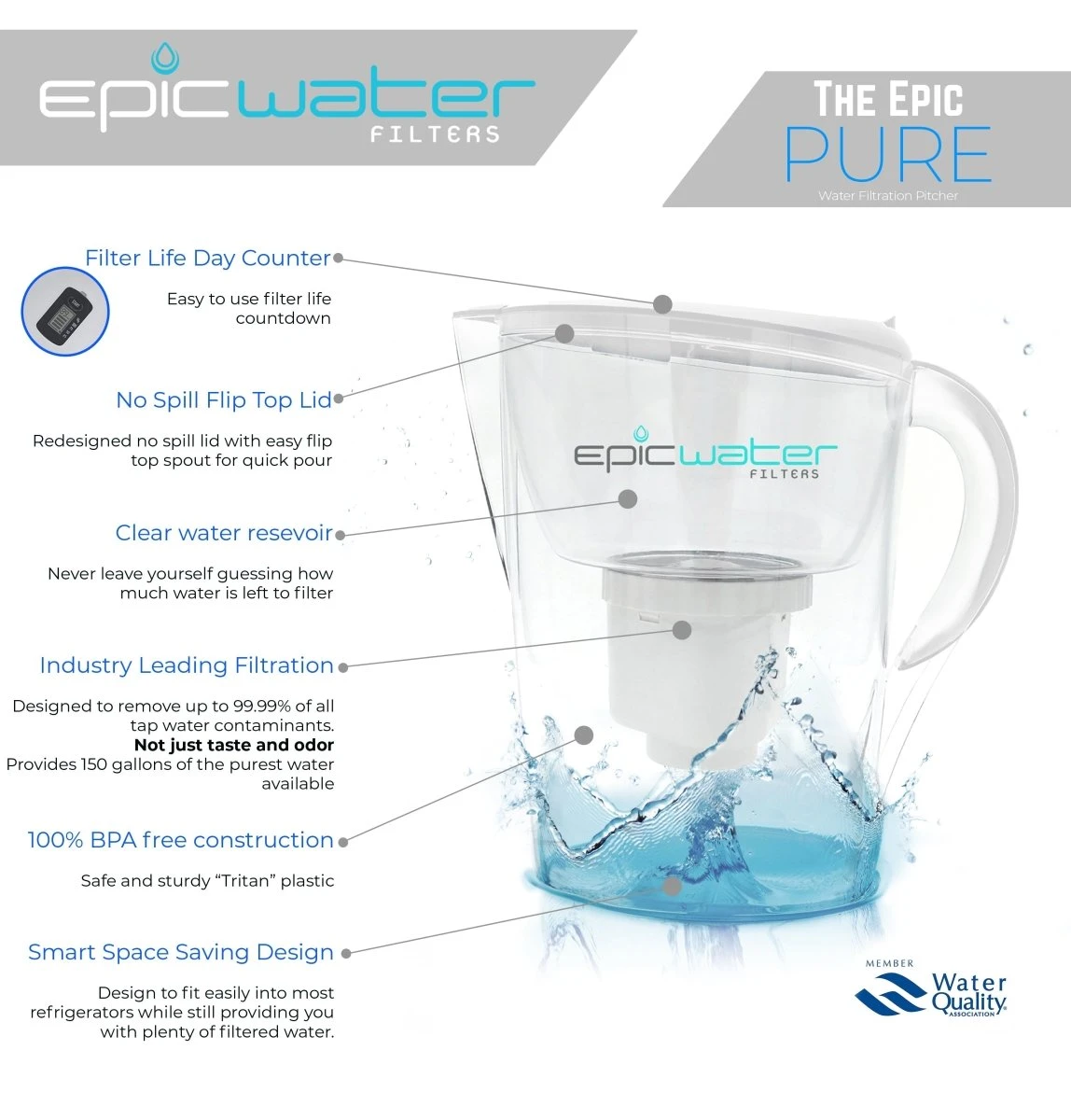 Upgrade your water quality with the Epic Pure Replacement Filter, designed to deliver consistently clean, refreshing, and great-tasting water. With advanced carbon block technology, this filter removes up to 99.9% of harmful contaminants, including fluoride, PFAS (Forever Chemicals), heavy metals, and more. Compatible with the Epic Pure Pitcher and Nano line of pitchers and dispensers, it’s the perfect solution for those seeking a healthier, eco-friendly hydration option.