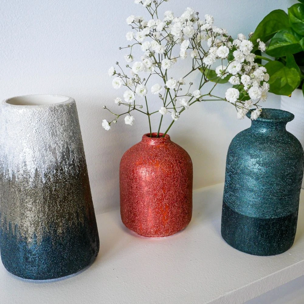 This craft kit includes five sugar metallic paints, three vases, and all the materials needed to create this textured art. In addition to glass, the paint can be used on wood, ceramic, canvas, terra cotta, and metal. Crafters will need water and paper towels.